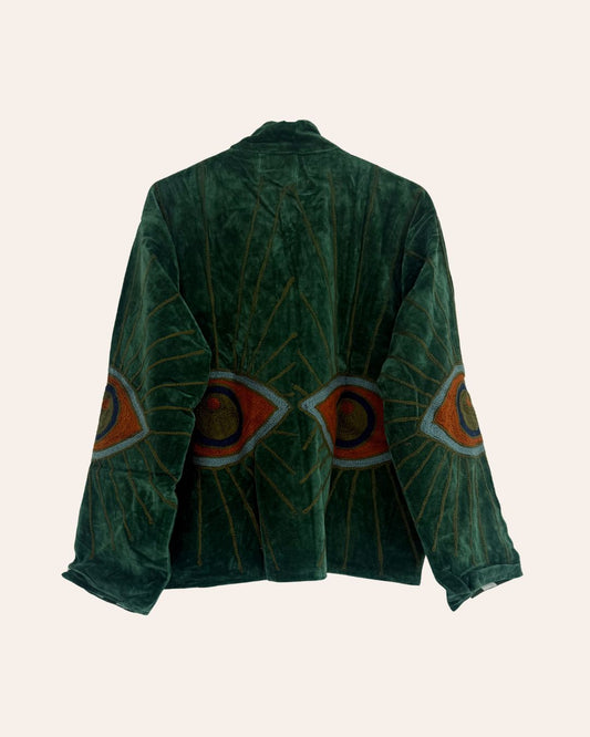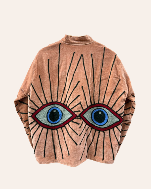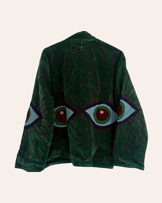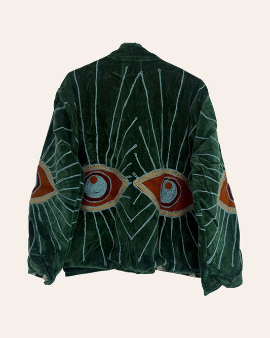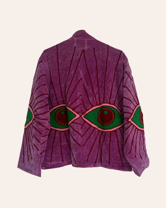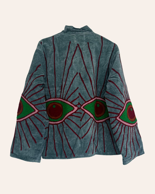 The Gaze - a velvet jacket in soft pastels, embroidered with a striking motif of eyes. Light yet warm, designed for Dubai’s cool winter nights.