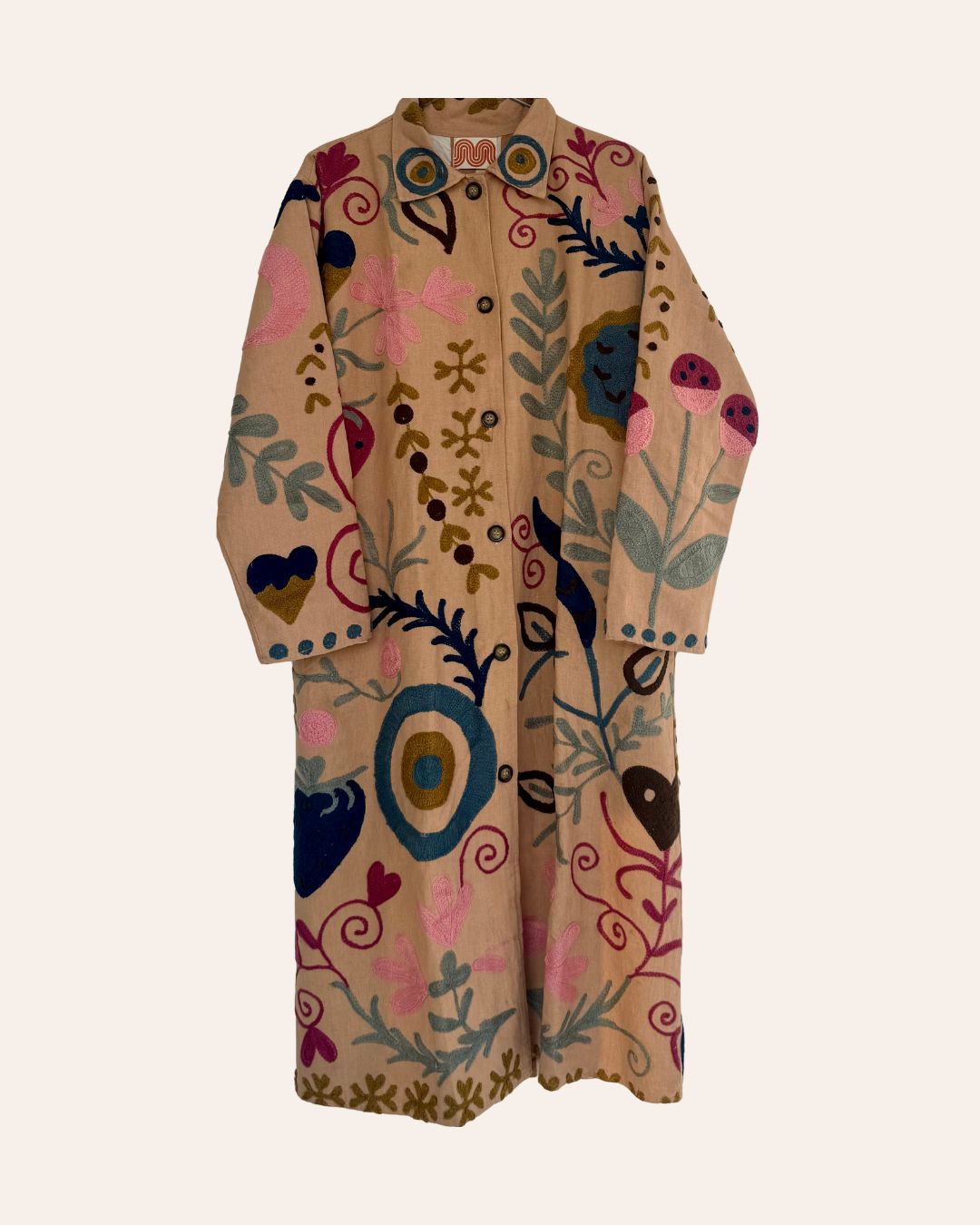 The Rumi - a beige summer jacket with side pockets, buttons, and Arabic embroidery of Iman, Rooh, and Sabr. Crafted by The Mismatched Studio.